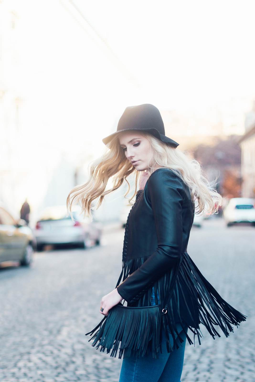 Me and my good friend (also known as my boss aka editor of Etiketa Magazin), a blogger newbie Eva decided to style the same black fringe leather jacket from New Yorker, each in our own way. For me it represents a fresh take on a classic wardrobe staple, with a western (and a bit rock-ish) touch. When working this detail statement-making piece into my wardrobe, I decided to keep it dark and simple, at least this time. So, keeping the rest of the look simple, a black tea underneath, skinny jeans, black pumps, a hat and a small fringe purse to keep up with the theme, my outfit was a nice counterweight to Eva’s a bit more romantic approach (check it out here). I love how the long strands dance with a wind, making each outfit effortlessly cool and a lot more fun.