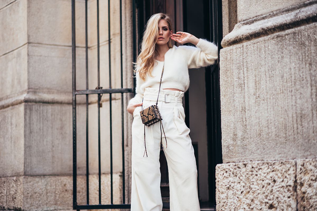 I’m sharing with you my second look in collaboration with H&M (check out the first one here). Their upcoming H&M Studio Collection Fall / Winter 2016 has totally won my heart. It’s full of folk and bohemian inspired pieces enriched with romantic and feminine touches. It’s all about female strength and empowerment, and that’s what I believe my all white look is all about. The combination of statement trousers, white fluffy sweater and a small unique snake-print bag is neither predictable nor completely safe, but definitely up my alley.